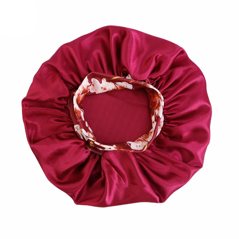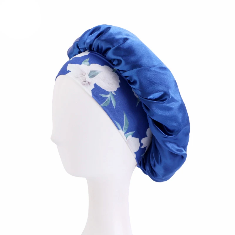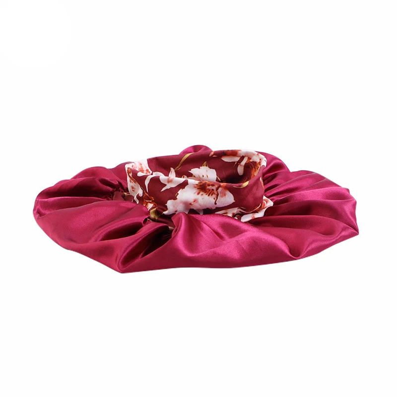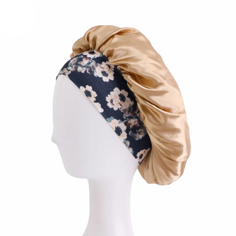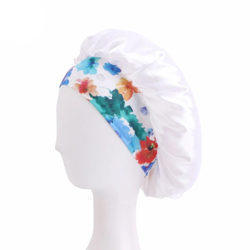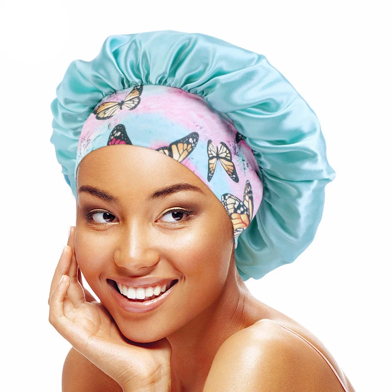蝶と花のプリントが施されたサテンのボンネット、バンドハット、カーリーヘア用のサテンのヘアラップ